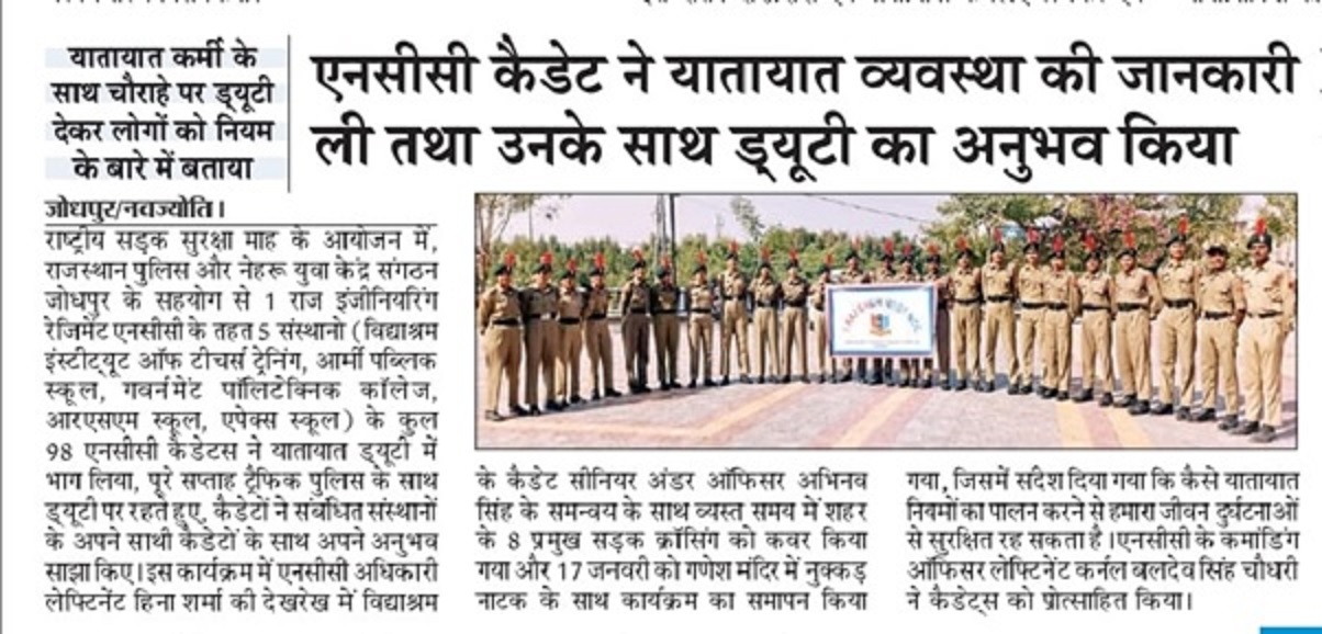 1 Raj Engr Regt, NCC, in collaboration with Rajasthan Police and Nehru Yuva Kendra Sangathan, Jodhpur, had participated in traffic duty wherein total of 98 NCC Cadets have participated from 5 different institutions.