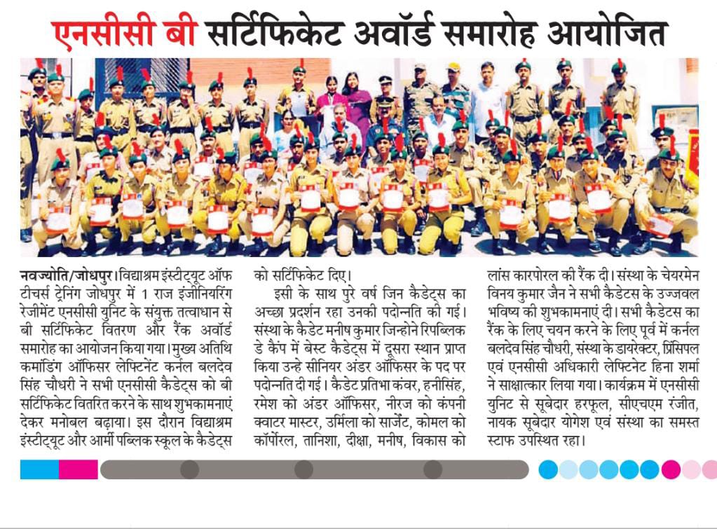 Award Ceremony was organized on Saturday, March 30, 2024 at Vidyashram Institute of Teacher's Training, Jodhpur under the joint aegis of 1 Raj Engineering Regiment NCC Unit. Certificates were given to the cadets of Vidhyasharm Institute of Teacher's Training and Army Public School. The chief guest, Commanding Officer Lieutenant Colonel Baldev Singh Chaudhary distributed B certificates to all the NCC cadets and wished everyone and boosted their morale.