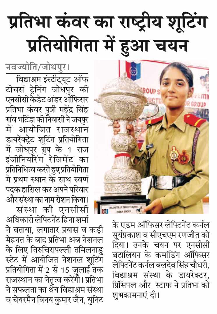 विद्याश्रम इंस्टिट्यूट ऑफ़ टीचर्स ट्रेनिंग जोधपुर की एनसीसी कैडेट अंडर ऑफिसर प्रतिभा कँवर पुत्री श्री महेंद्र सिंह गांव भटिंडा की निवासी ने जयपुर मे आयोजित राजस्थान डायरेक्टरेट शूटिंग प्रतियोगिता मे जोधपुर ग्रुप के 1 राज इंजीनियरिंग रेजिमेंट का प्रतिनिधित्व करते हुए प्रतियोगिता मे प्रथम स्थान के साथ स्वर्ण पदक हासिल किया एवम अपने परिवार और संस्था का नाम रोशन किया. संस्था की एनसीसी अधिकारी लेफ्टिनेंट हिना शर्मा ने बताया की लगातार प्रयास और कड़ी मेहनत के बाद प्रतिभा अब नेशनल के लिए तिरुचिरापल्ली, तमिलनाडु स्टेट मे आयोजित नेशनल शूटिंग प्रतियोगिता में 2 जुलाई से 15 जुलाई तक राजस्थान का नेतृत्व करेंगी. उनके चयन पर एनसीसी बटालियन के कमांडिंग ऑफिसर लेफ्टिनेंट कर्नल बलदेव सिंह चौधरी, एडम ऑफिसर लेफ्टिनेंट कर्नल सूर्यप्रकाश, विद्याश्रम संस्था के चेयरमैन श्री विनय कुमार जैन, डायरेक्टर, प्रिंसिपल और समस्त स्टाफ ने प्रतिभा के हौसले की सराहना करते हुए बधाई एवम शुभकामनाये दी.